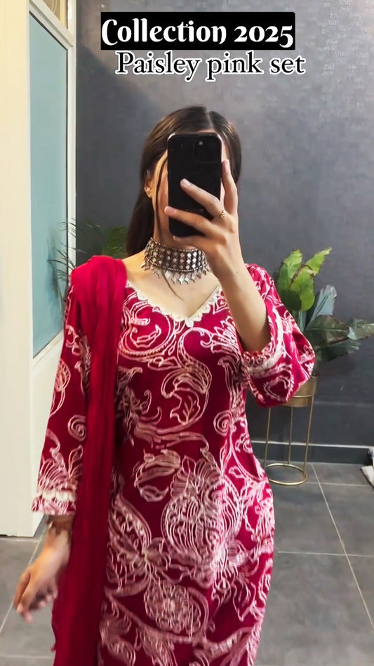 Pink Cotton Paisley Straight Full Sleeves Kurta and Pant Set with Dupatta