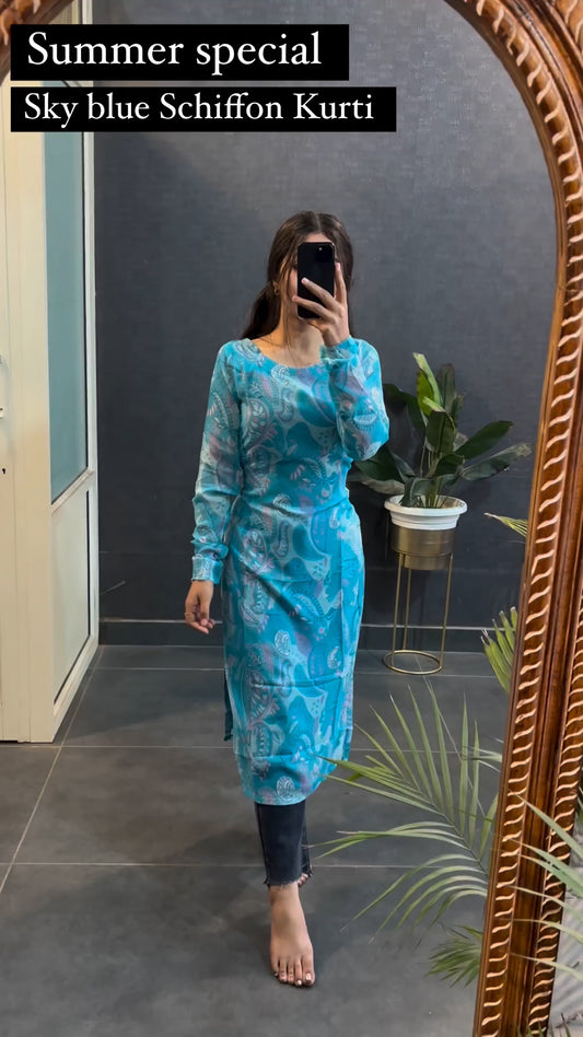 Blue Pongal Cotton Printed Kurti in Full Sleeves