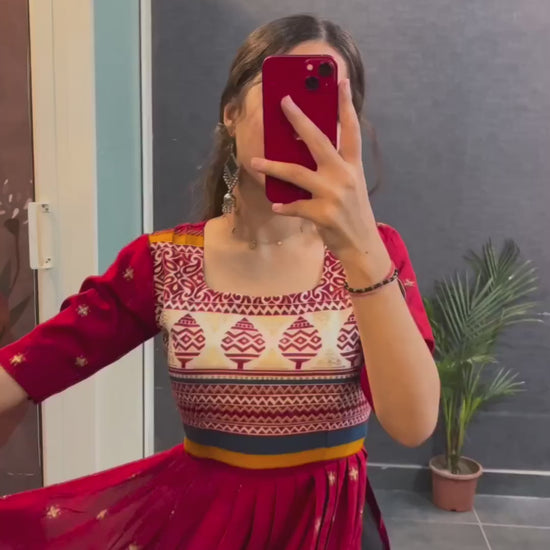 Red Rayon Printed Cotton Nayra Cut Kurti