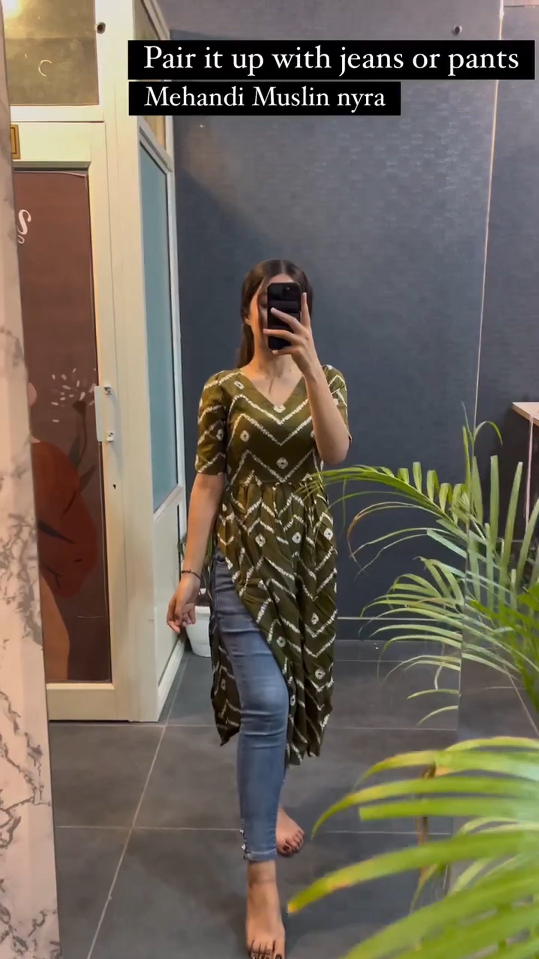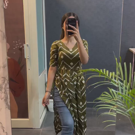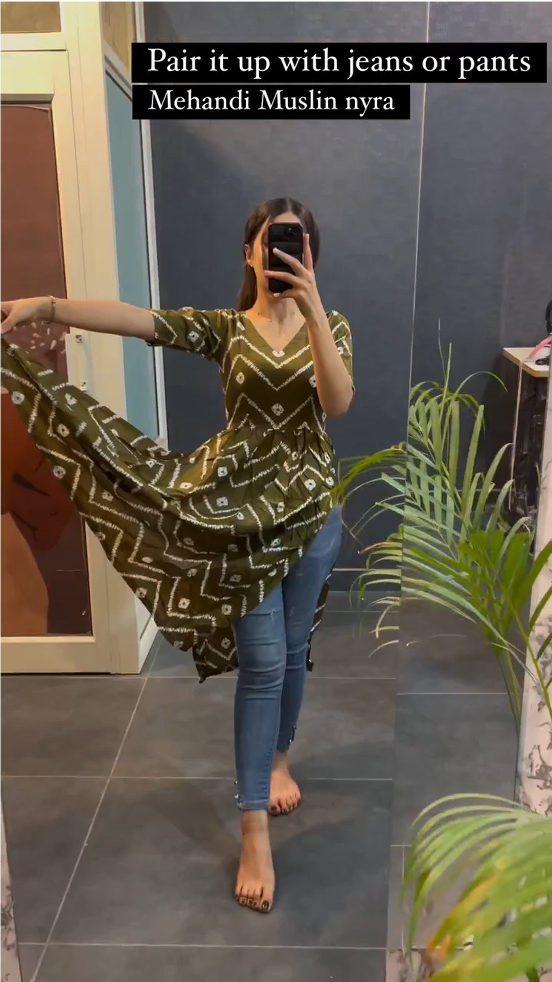 New Womens Mahendi Colour Printed Cotton Nyra Cut Kurti